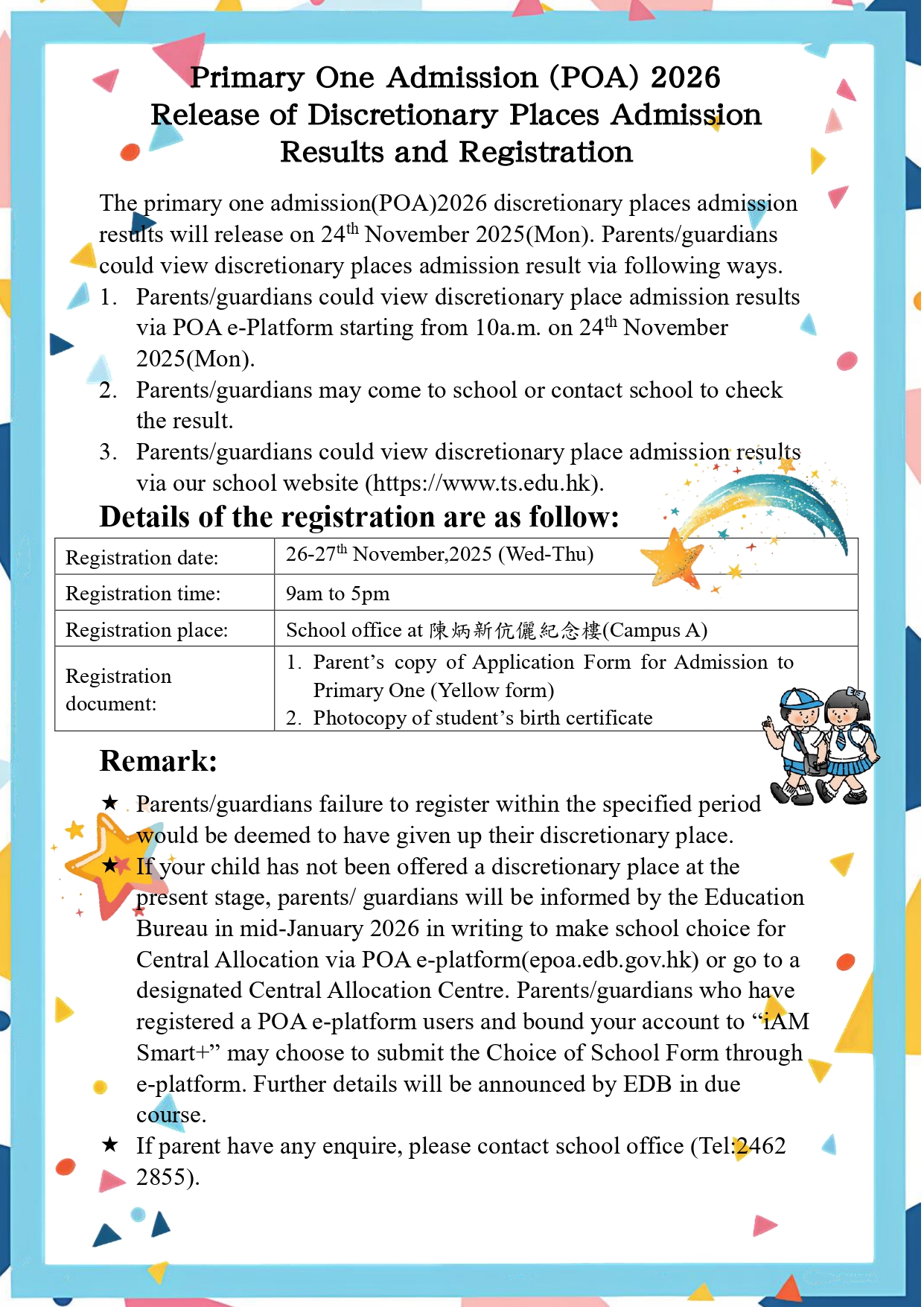 2025年度「自行分配學位」取錄名單將於2025年11月24日(星期一)公佈,家長可親臨本校查閱或透過「小一入學電子平台」查閱。