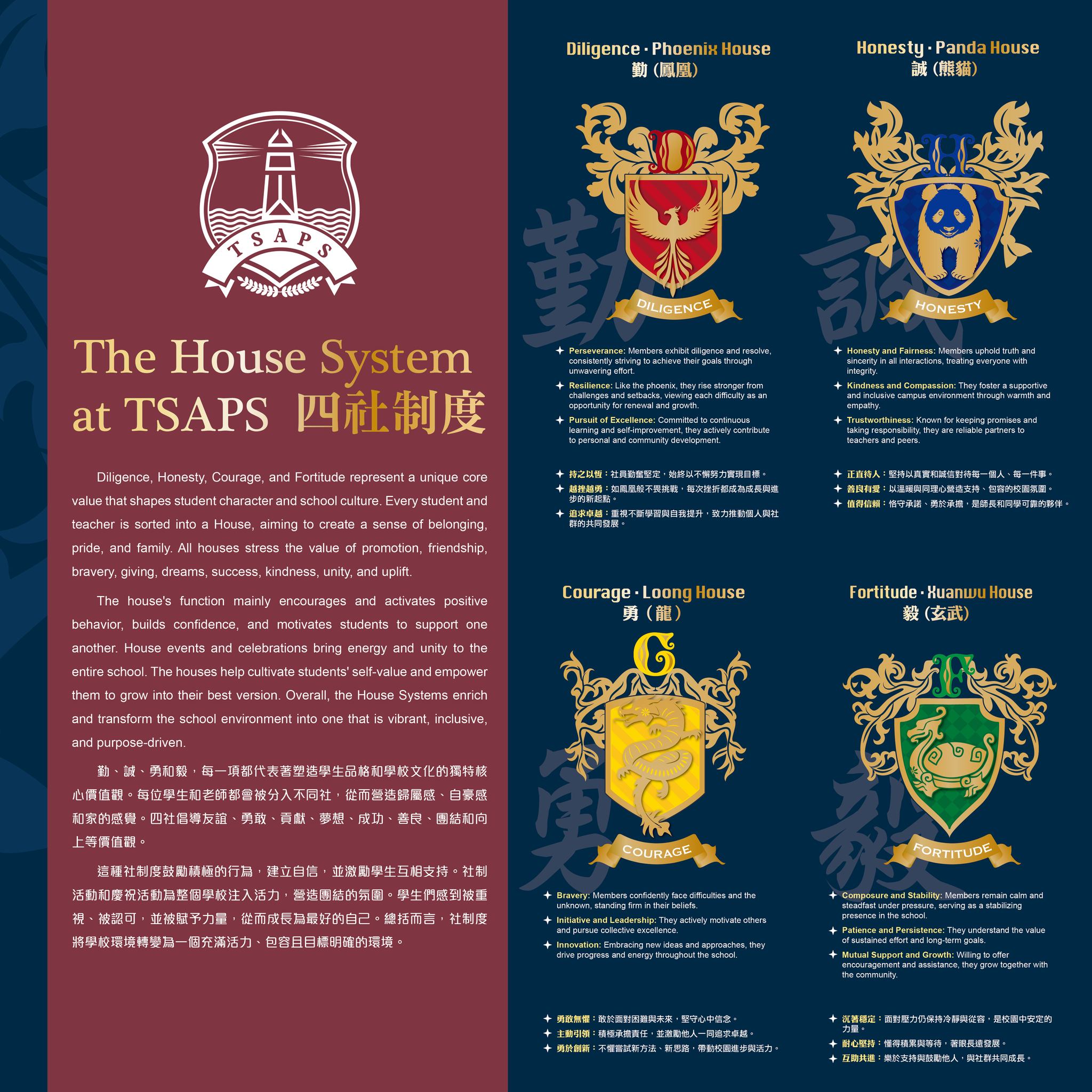 勤、誠、勇和毅,每一項都代表著塑造學生品格和學校文化的獨特核心價值觀。每位學生和老師都會被分入不同社,從而營造歸屬感、自豪感和家的感覺。四社倡導友誼、勇敢、貢獻、夢想、成功、善良、團結和向上等價值觀。